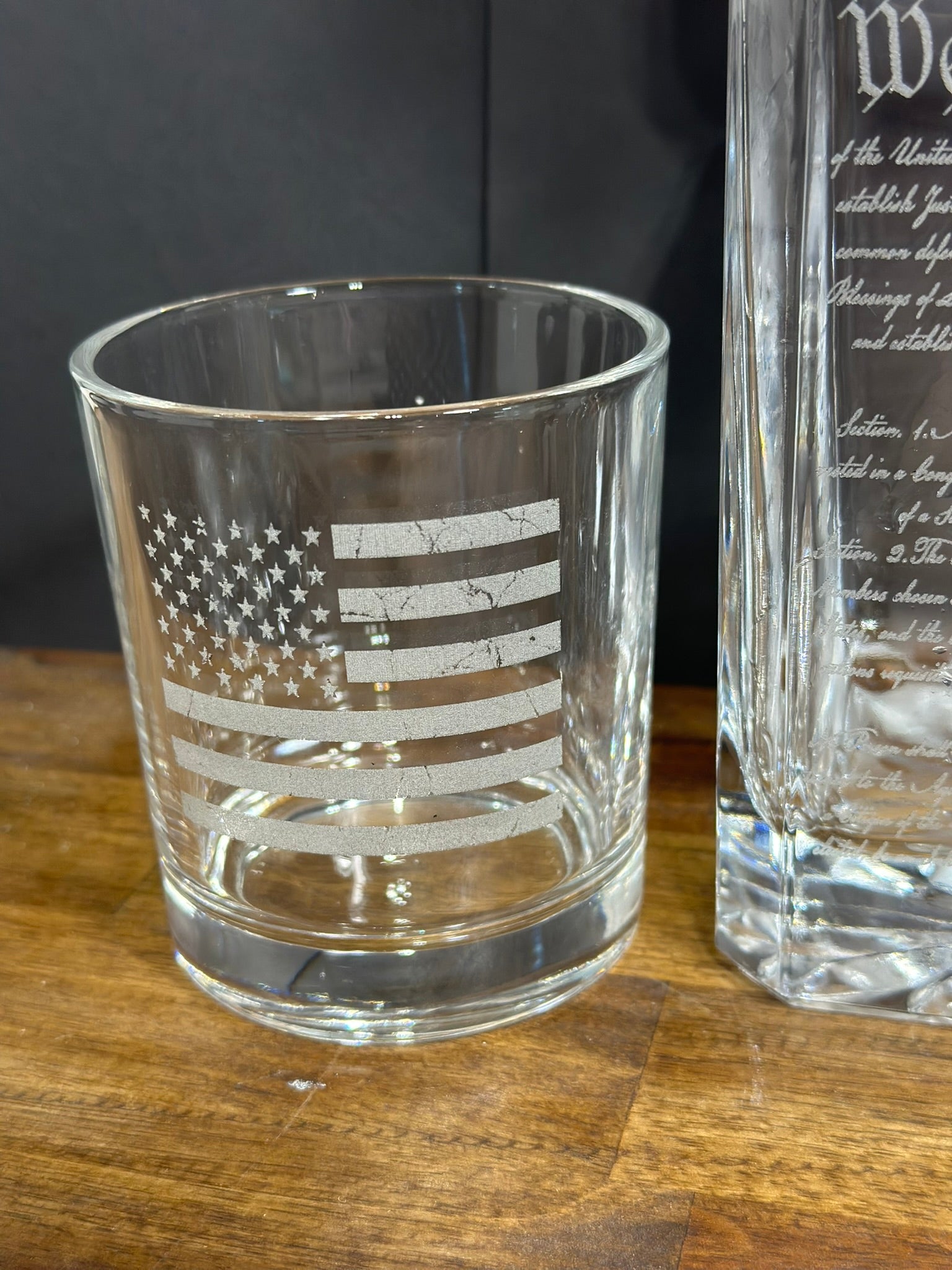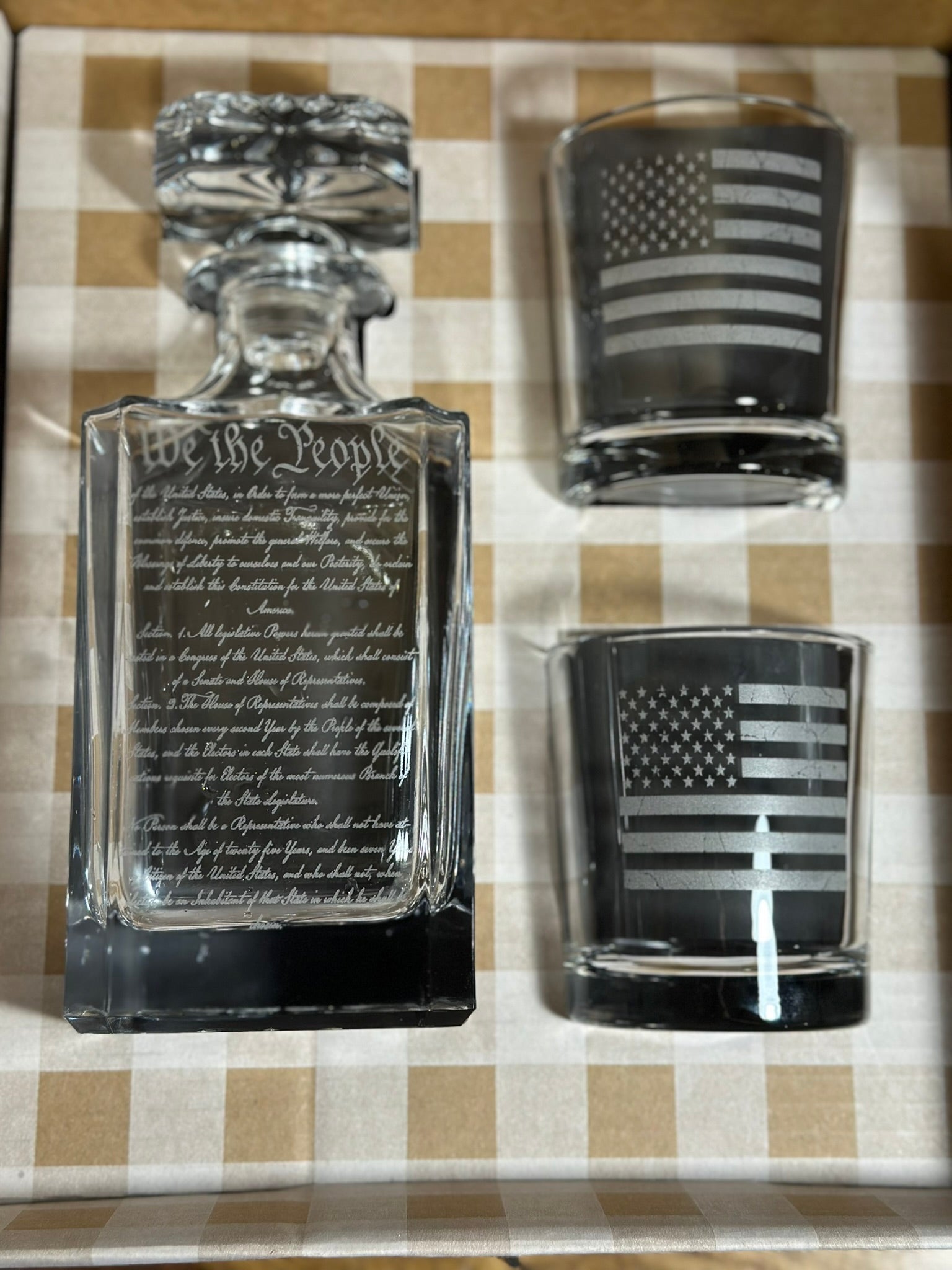 Elevate your whiskey experience with this distinguished decanter and glass set, featuring a laser-engraved "We The People" design that makes a bold patriotic statement. The elegant decanter preserves your whiskey's character while the accompanying glass is perfectly proportioned for savoring premium spirits. Crafted for the discerning collector, this set combines functional sophistication with meaningful artistry—ideal for personal enjoyment or as a memorable gift for the whiskey enthusiast who appreciates both quality and symbolism.