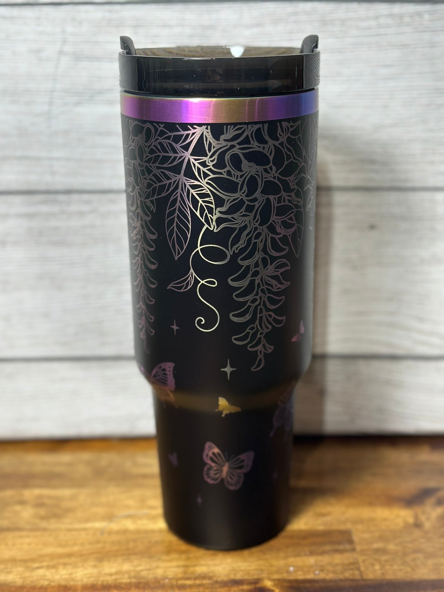 Elevate your hydration routine with this striking 40 oz tumbler, featuring intricate laser-engraved wisteria flowers that cascade across an elegant ombre finish. The precision engraving showcases delicate floral details with exceptional clarity, while the generous capacity keeps your beverages at the perfect temperature throughout the day. Durable construction meets artistic design, making this tumbler both a functional essential and a conversation-starting accessory for those who appreciate refined craftsmanship and botanical beauty.